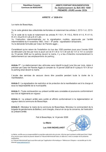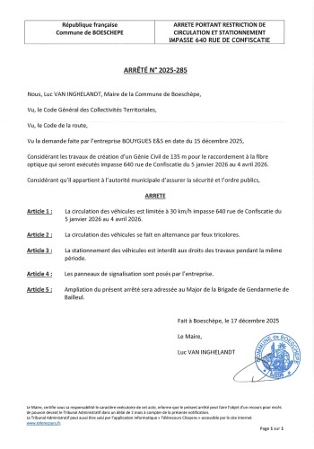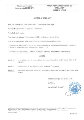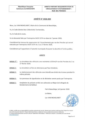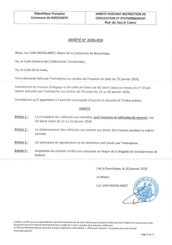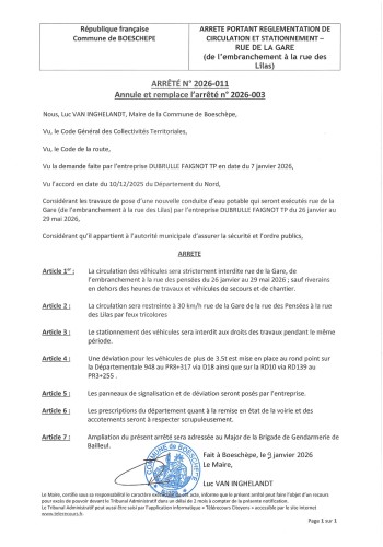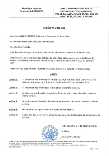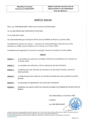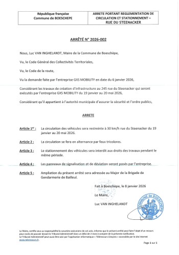 CIRCULATION ET STATIONNEMENT Stationnement interdit devant le 42 Grand Place du 5 au 9 février ET pose d'échafaudage - MACONNERIE DES FLANDRES arrete_maconnerie_des_flandres.pdf Consulter Taille : 264.22 Ko Extension du fichier : pdf Publié le 03 Fév. 2026 Occupation du domaine public, rue de Poperinghe arrete_travaux_wallyn.pdf Consulter Taille : 208.1 Ko Extension du fichier : pdf Publié le 30 Jan. 2026 Circulation interdite rue de la mairie le lundi 9 février de 9 h à 11 h - A MI-BOIS arrete_a_mi-bois.pdf Consulter Taille : 173.78 Ko Extension du fichier : pdf Publié le 03 Fév. 2026 Pose nouvelle conduite d'eau potable rue de la Gare du 26 janvier au 29 mai - DUBRULLE FAIGNOT TP arrete_travaux_dubrulle_faignot_tp.pdf Consulter Taille : 277.8 Ko Extension du fichier : pdf Publié le 10 Jan. 2026 Travaux élagage rue du Sacré Coeur - Les jardins de l'évasion arrete_rue_du_sacre_coeur.pdf Consulter Taille : 203.27 Ko Extension du fichier : pdf Publié le 23 Jan. 2026 Interdiction stationnement rue de la maire devant le 38 rue de la mairie (3 places de stationnement) du 26 janvier au 6 février - A MI-BOIS pose_echafaudage_et_stationnement.pdf Consulter Taille : 255.33 Ko Extension du fichier : pdf Publié le 23 Jan. 2026 Réparation du réseau électrique rue de Méteren - ROTEL arrete_rotel.pdf Consulter Taille : 223.61 Ko Extension du fichier : pdf Publié le 15 Jan. 2026 Suppression de 3 branchements gaz rue des Pensées - SADE CGTH arrete_sade_cgth.pdf Consulter Taille : 209.04 Ko Extension du fichier : pdf Publié le 08 Jan. 2026 Création d'une infrastructure (fibre) rue du Steenacker - GXS MOBILITY arrete_gxs_mobility.pdf Consulter Taille : 215.34 Ko Extension du fichier : pdf Publié le 08 Jan. 2026 Travaux d'aiguillage et tirage de câbles fibre optique rue de Bailleul, Grand place, rue du Mont et rue de la Roume - SAS BENOIT CHEVRIER arrete_sas_benoit_chevrier.pdf Consulter Taille : 246.62 Ko Extension du fichier : pdf Publié le 10 Jan. 2026 Travaux de génie civil (fibre) impasse 640 rue de Confiscatie - BOUYGUES E&S arrete_travaux_bouygues.pdf Consulter Taille : 224.38 Ko Extension du fichier : pdf Publié le 10 Jan. 2026 Travaux de marquage au sol annuel - MIDITRACAGE arrete_permanent_miditracage.pdf Consulter Taille : 300.04 Ko Extension du fichier : pdf Publié le 11 Déc. 2025 Stationnement Bus des 1000 premiers jours arrete_bus_des_1000_premiers_jours.pdf Consulter Taille : 313.51 Ko Extension du fichier : pdf Publié le 15 Jan. 2026 Marché du mardi - interdiction de stationner arrete_marche_du_mardi.pdf Consulter Taille : 204.95 Ko Extension du fichier : pdf Publié le 10 Sep. 2025