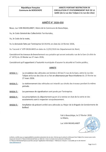 CIRCULATION ET STATIONNEMENT Réfection de la voirie rue Kouckestraat du 4 au 20 mars - EUROVIA arrete_eurovia.pdf Consulter Taille : 211.79 Ko Extension du fichier : pdf Publié le 25 Fév. 2026 Branchement eau potable rue de la Gare du 23 février au 27 mars - SA DUVAL arrete_duval.pdf Consulter Taille : 231.78 Ko Extension du fichier : pdf Publié le 25 Fév. 2026 Arrêté complémentaire travaux rue de la Gare - DUBRULLE FAIGNOT TP arrete_dubrulle_complement.pdf Consulter Taille : 271.93 Ko Extension du fichier : pdf Publié le 04 Fév. 2026 Occupation du domaine public, rue de Poperinghe arrete_travaux_wallyn.pdf Consulter Taille : 208.1 Ko Extension du fichier : pdf Publié le 30 Jan. 2026 Pose nouvelle conduite d'eau potable rue de la Gare du 26 janvier au 29 mai - DUBRULLE FAIGNOT TP arrete_travaux_dubrulle_faignot_tp.pdf Consulter Taille : 277.8 Ko Extension du fichier : pdf Publié le 10 Jan. 2026 Réparation du réseau électrique rue de Méteren - ROTEL arrete_rotel.pdf Consulter Taille : 223.61 Ko Extension du fichier : pdf Publié le 15 Jan. 2026 Suppression de 3 branchements gaz rue des Pensées - SADE CGTH arrete_sade_cgth.pdf Consulter Taille : 209.04 Ko Extension du fichier : pdf Publié le 08 Jan. 2026 Création d'une infrastructure (fibre) rue du Steenacker - GXS MOBILITY arrete_gxs_mobility.pdf Consulter Taille : 215.34 Ko Extension du fichier : pdf Publié le 08 Jan. 2026 Travaux de génie civil (fibre) impasse 640 rue de Confiscatie - BOUYGUES E&S arrete_travaux_bouygues.pdf Consulter Taille : 224.38 Ko Extension du fichier : pdf Publié le 10 Jan. 2026 Travaux de marquage au sol annuel - MIDITRACAGE arrete_permanent_miditracage.pdf Consulter Taille : 300.04 Ko Extension du fichier : pdf Publié le 11 Déc. 2025 Stationnement Bus des 1000 premiers jours arrete_bus_des_1000_premiers_jours.pdf Consulter Taille : 313.51 Ko Extension du fichier : pdf Publié le 15 Jan. 2026 Marché du mardi - interdiction de stationner arrete_marche_du_mardi.pdf Consulter Taille : 204.95 Ko Extension du fichier : pdf Publié le 10 Sep. 2025