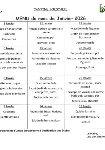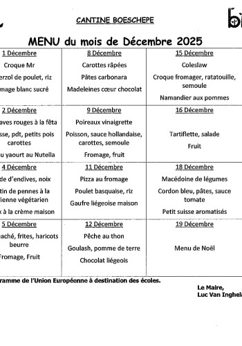 Menu cantine décembre menu_decembre.pdf Consult Size : 28.79 KB File extension : pdf Published at 12 Nov. 2025 Menu cantine janvier 2026 menu_janvier_2026.pdf Consult Size : 261.68 KB File extension : pdf Published at 05 Dec. 2025