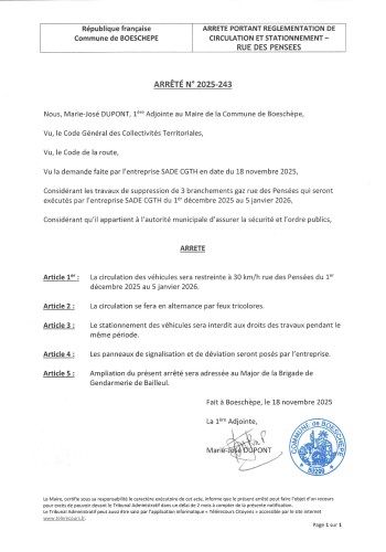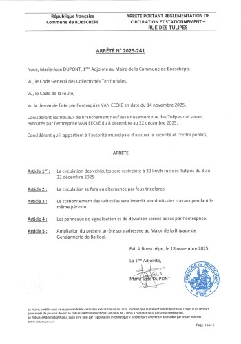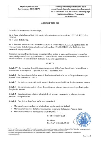 CIRCULATION ET STATIONNEMENT Travaux rue des Tulipes - VAN EECKE arrete_travaux_rue_des_tulipes.pdf Consult Size : 212.19 KB File extension : pdf Published at 19 Nov. 2025 Travaux rue des Pensées - SADE arrete_travaux_rue_des_pensees.pdf Consult Size : 217.23 KB File extension : pdf Published at 19 Nov. 2025 Travaux de marquage au sol annuel - MIDITRACAGE arrete_permanent_miditracage.pdf Consult Size : 300.04 KB File extension : pdf Published at 11 Dec. 2025 Marché du mardi - interdiction de stationner arrete_marche_du_mardi.pdf Consult Size : 204.95 KB File extension : pdf Published at 10 Sep. 2025